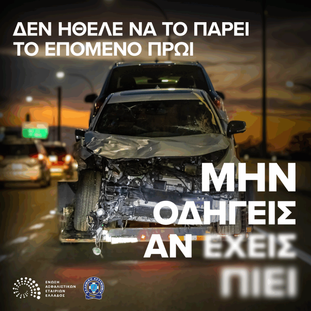 Στο πλαίσιο αυτό, η ΕΑΕΕ ξεκινά νέα καμπάνια ευαισθητοποίησης των πολιτών σχετικά με τις καταστροφικές συνέπειες του αλκοόλ στην οδήγηση με μήνυμα «Μην οδηγείς αν έχεις πιεί».