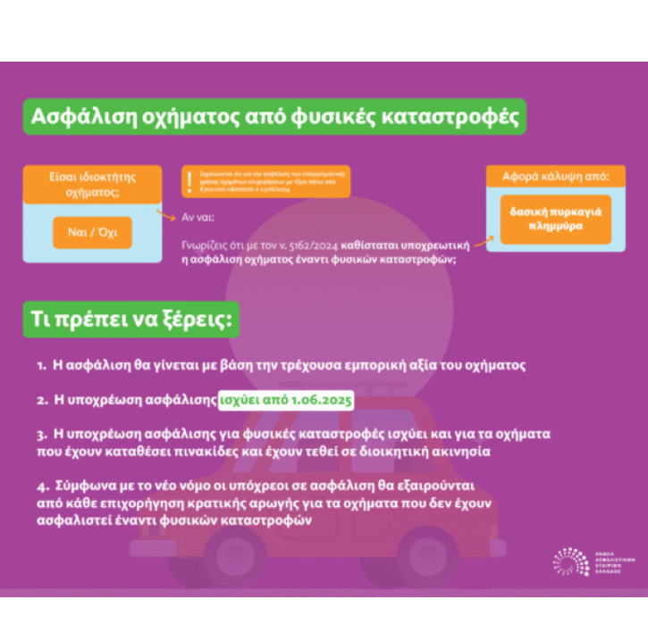 Η Ένωση Ασφαλιστικών Εταιριών Ελλάδος (ΕΑΕΕ), με αφορμή τη θέσπιση της υποχρεωτικής ασφάλισης οχήματος έναντι φυσικών καταστροφών από τον Νόμο 5162/2024, δημιούργησε ένα σύντομο γράφημα για την ενημέρωση των ιδιοκτητών.